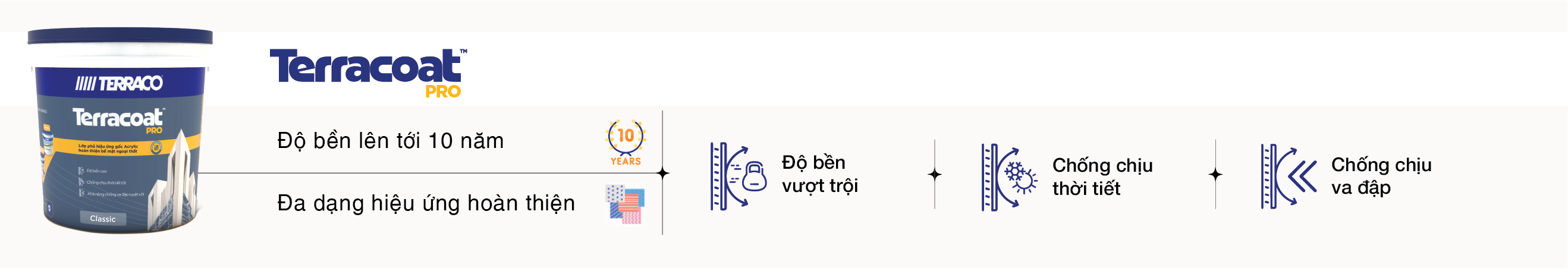 Dòng sản phẩm Sơn gai Terracoat là bộ sưu tập đa dạng các kiểu vân gai trang trí bắt mắt, giúp khách hàng thỏa sức sáng tạo với các ý tưởng thiết kế khác nhau trong không gian nội và ngoại thất. Sản phẩm không những tạo nên vẻ đẹp ấn tượng cho kiến trúc, mà còn có độ bền cao với tính năng kháng tia UV, chịu được va đập, mài mòn và sự thay đổi khắc nghiệt của thời tiết.