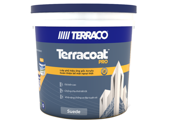 Terracoat Suede là lớp phủ Acrylic trộn sẵn, sản phẩm tạo ra sự kết hợp tuyệt vời giữa bề mặt vân gai cao cấp và tính kinh tế nổi bật thông qua việc dễ dàng sử dụng, mức tiêu tốn nguyên liệu thấp và độ bền vững của bề mặt. Terracoat Suede có tuổi thọ lâu dài, có khả năng chống lại sự bong tróc và phai màu. Terracoat Suede kết dính với bề mặt bên trong cũng như bên ngoài của tấm thạch cao, tấm gỗ ép, thép có lớp lót chống gỉ, tường khô thạch cao,vữa cát/xi măng và bê tông.
